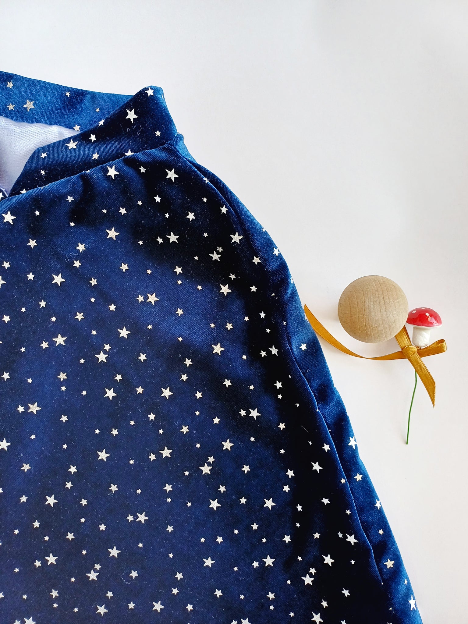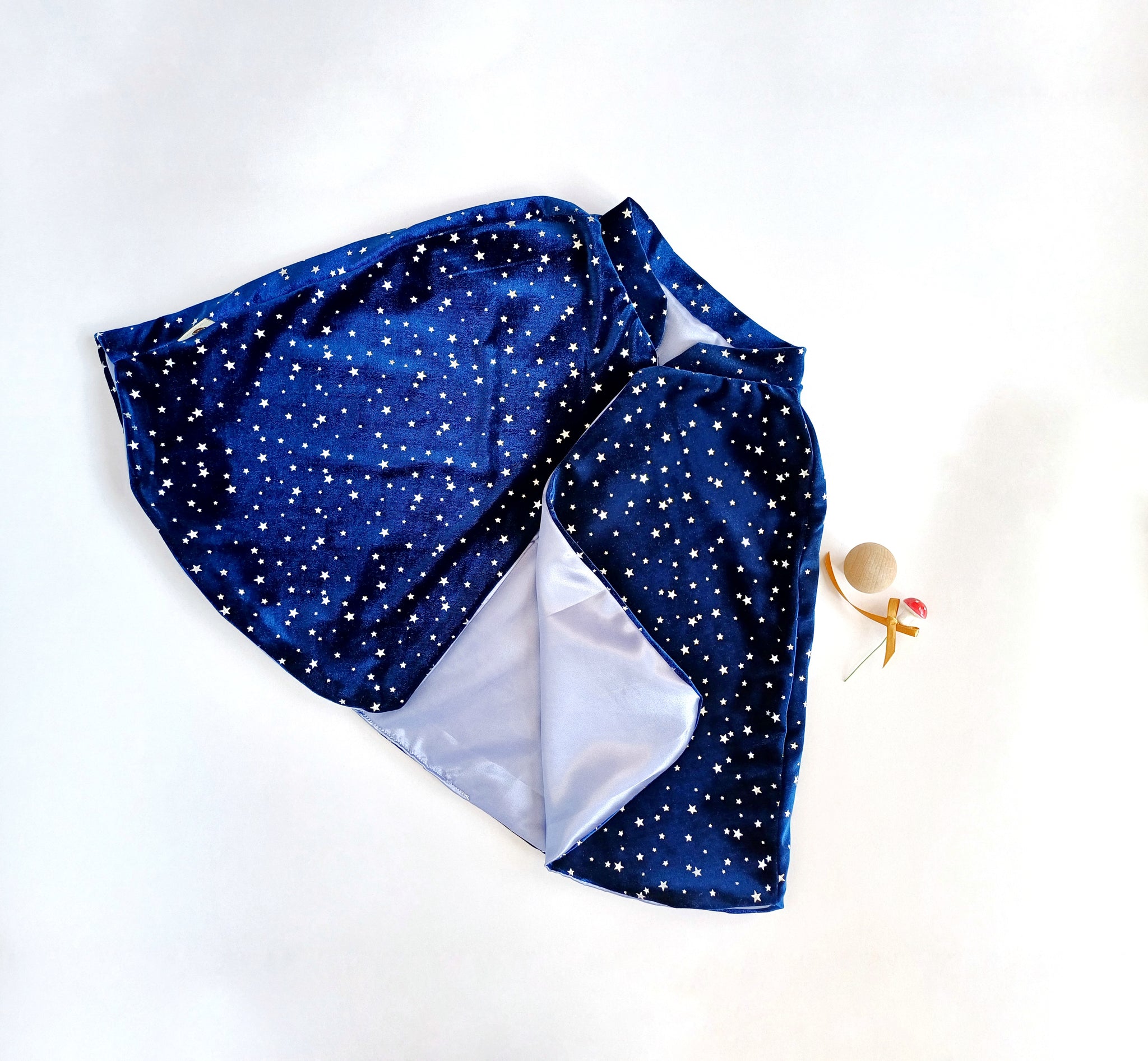 Esta capita de terciopelo con estrellas en color plata entrega toda la magia y belleza a esta historia. Confeccionado con materiales de calidad, con forro y broche en el cuello para cerrar y brindar comodidad.